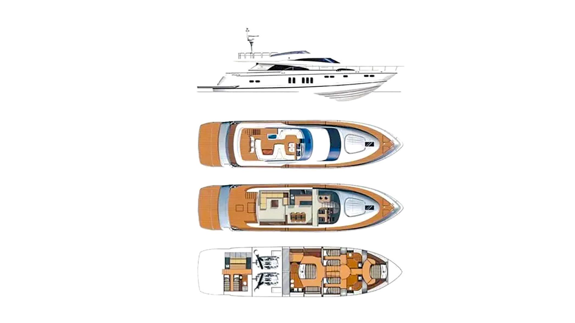 - Spacious flybridge with panoramic views, sun loungers, and ample seating